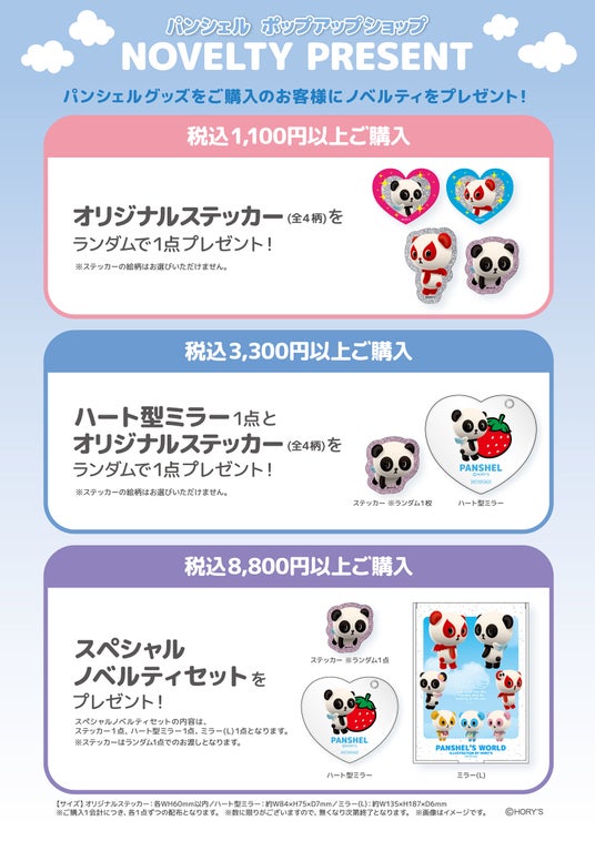 今回、ご購入金額によってもらえる特典として「オリジナルステッカー」「ハート型ミラー」「ミラー(L)」をご用意しております。さらに、期間中にご来場いただいた方に特典として「ARフォトフレーム」を無料で体験していただけます。お手持ちのスマートフォンを使って「パンシェル」や「パンデビ」のARと記念撮影をぜひお楽しみください。
