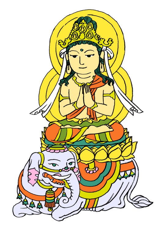仏教には「十三仏信仰」と「守り本尊」という考え方があります。そこでは初七日から三十三回忌までの13回の追善供養の際に、亡くなった人を浄土に導く仏さまを「十三仏」として伝え、古くから信仰を集めていました。そのうち八尊は十二支の守護仏「守り本尊」として伝わり、私たちに降りかかる災厄から守ってくれるといいます。辰年と巳年をつかさどる普賢菩薩さまは、法華経を守る仏さまでもあり、合掌して白象に乗るお姿で表されます。
