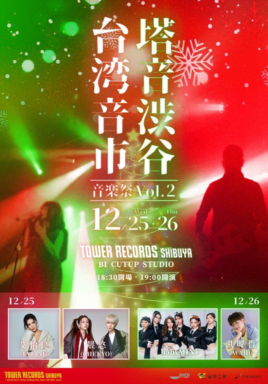 2024年12月25日(水)・26日(木)の2日間、台湾を代表するアーティストが出演するライブイベント「塔音渋谷『台湾音市』音楽祭 Vol.2」が、タワーレコード渋谷店B1 CUTUP STUDIOで開催されます。「塔音渋谷『台湾音市』音楽祭 Vol.2」では、台湾を代表するアーティスト4組が参加。この特別なイベントで、台湾の才能豊かなアーティストたちと一緒に素晴らしい音楽の世界を体験してください!
