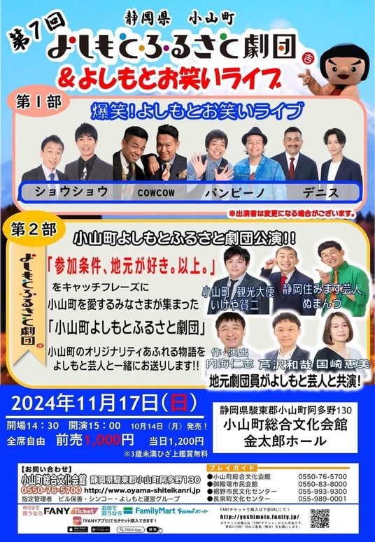11月17日(日)小山町総合文化会館金太郎ホールにて、第7回小山町よしもとふるさと劇団公演が開催され、小山町観光親善大使を務めるいけや賢二をはじめ、静岡県住みます芸人のぬまんづ(うえたけ・原いい日)らが参加しました。