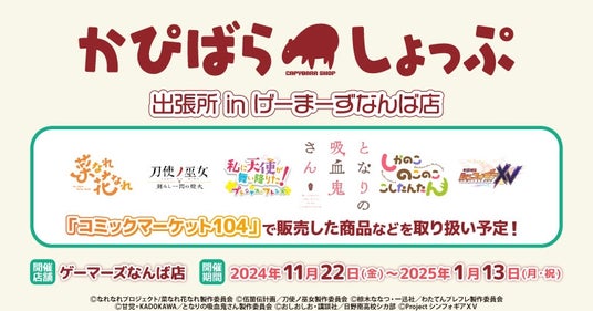 ゲーマーズなんば店のリニューアルにあわせて、大人気「かぴばらしょっぷ」がなんば店へ出張決定! 「コミックマーケット104」で販売した商品などを取り扱い予定!