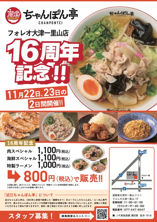 滋賀県を拠点とするドリームフーズ株式会社(本社:滋賀県彦根市、代表取締役:山本英柱)は、地域の皆様に愛される「近江ちゃんぽん亭 フォレオ大津一里山店」が16周年を迎えることを記念し、感謝を込めた特別イベントを開催いたします。この2日間限定のイベントでは、人気メニューを特別価格800円(税込)でご提供。日頃のご愛顧に応える形で、地域の皆様とともにこの特別な節目を祝います。