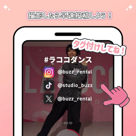 LACOCOルームで #ラココダンス を踊ってSNSに投稿すると予約者さまにスタジオ料金を2時間分全額キャッシュバックいたします。詳細は、下記URLよりご確認ください。