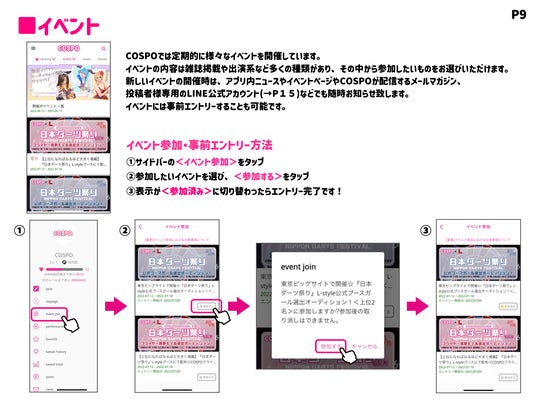 「COSPO」アプリ内のサイドバーの「event join」から該当のバナーをタップしてイベントにご参加ください。