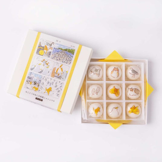ねこまきさんの作品「狩り」をテーマにした和風マシュマロのセット。卵白を寒天で固めた、ぷにっとやわらかな触感のお菓子です。ねこまきさんの描く、水彩タッチの猫とウミネコイラストが鮮やかにプリントされています。