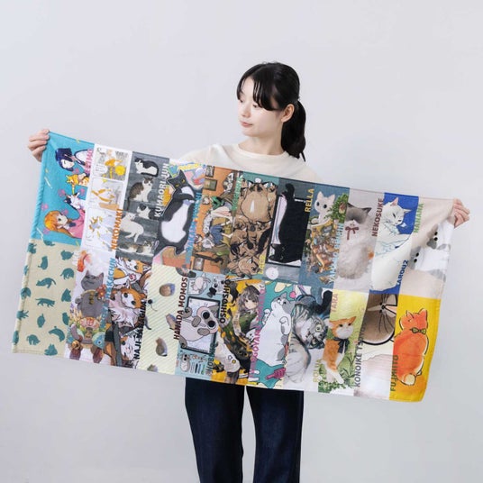 参加クリエイター22名の全イラストを楽しめるビッグタオル。ブランケット感覚で使えるサイズ感です。生地は綿100%で肌触りもよく、たっぷりとした厚みがある仕上がりです。