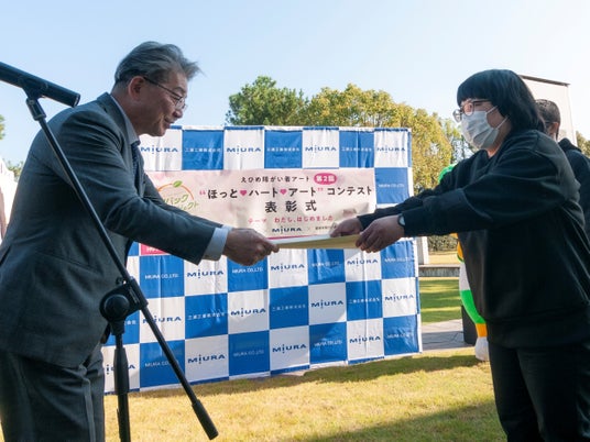 【三浦工業株式会社】紙ンバックプロジェクト2024第2回 ‟ほっと・ハート・アート“コンテスト表彰式をミウラート・ヴィレッジで実施~特別審査員 バリィさんとみきゃんもお祝いに駆けつけました~