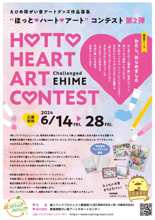 愛媛県内在住の障がい者を対象としたアップサイクル品を彩る障がい者アートの『ほっと・ハート・アート コンテスト』は、多様性への理解向上と障がいのある方達の自立や社会参画を支援しています。今回のコンテストでは、81名の作家から95点もの作品をご応募いただき、障がい者アートを沢山の人に知ってもらうきっかけとなりました。