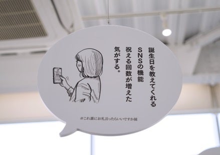 会場の入り口には吹き出し型のパネルで「#これ誰にお礼言ったらいいですか展」と展示タイトルを掲出しています。また、展示タイトルはご来場記念のフォトスポットとしてもご利用いただけます。