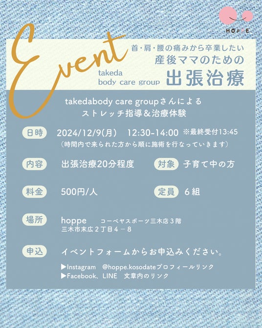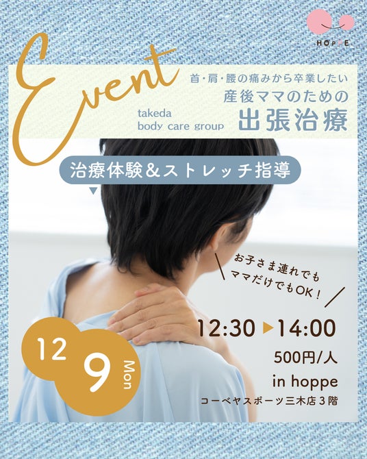 特定非営利活動法人ほっぺ(代表:大森 奈津子・兵庫県三木市)は、takedabody care groupさんをお招きし、2024年12月9日(月)hoppe(コーベヤスポーツ三木店3階)にて、『産後ママのための出張治療』を開催いたします。