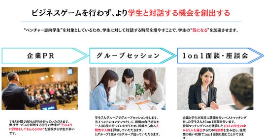 こんなのおかしくないか、と思い直接ベンチャー企業がベンチャー志向の学生にアピールができる場があれば、学生の選択肢がググっと広がるのではないか!と考えました。