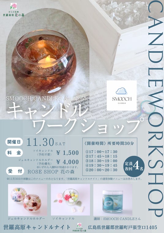 「世羅高原キャンドルナイト」では、広島を拠点に活動するキャンドル作家「SMOOCH(スムーチ)CANDLE」さんによるキャンドルづくりワークショップを開催します。