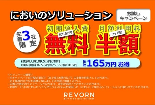 株式会社レボーン(本社:東京都中央区、代表:松岡 広明)は、本日2024年11月25日(月)から、中小製造業(年間売上高100億円以下)の支援を目的に、製造過程などで発生する「におい」の課題を解決する為の「におい」センシングデバイスを用いたAIソリューションを先着3社限定で、初期導入費109.5万円を無料、さらに月額利用料36.5万円を3ヶ月間半額の18万円で提供いたします。