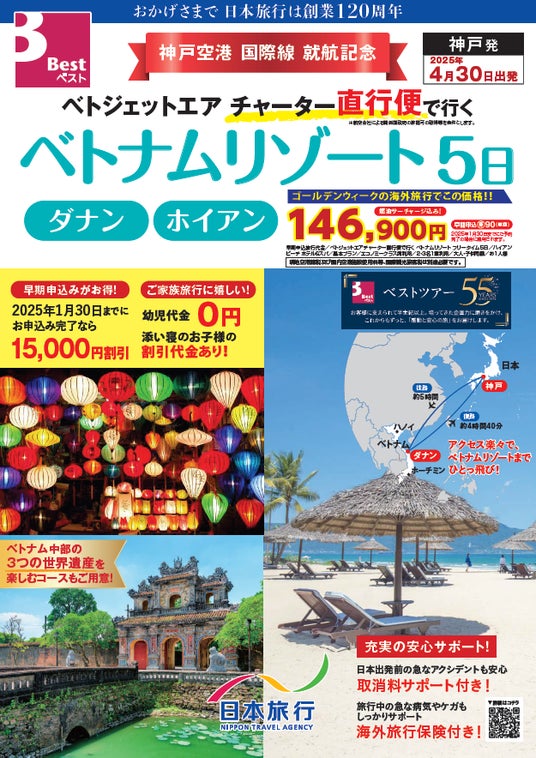 株式会社日本旅行(本社:東京都中央区、代表取締役社長:小谷野悦光)は、2025年春の神戸空港国際化を記念し、「ベトジェットエア チャーター直行便で行く ベトナムリゾート5日」を発売します。2025年は、当社の創業120周年の記念の年となり、本商品は「日本旅行創業120周年記念ツアー」の海外旅行商品第1弾となります。