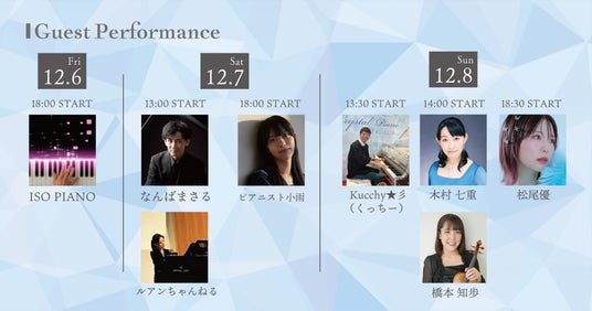 開催期間中プロピアニストによるゲスト演奏を行います。YouTubeなどのSNS、TVで活躍する今話題のピアニストによる迫力の演奏をお楽しみください。