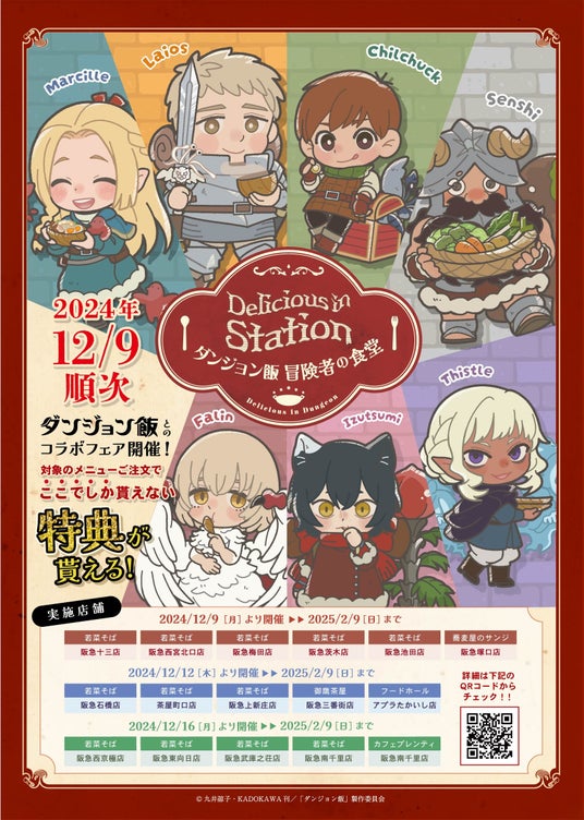 飲食事業を手掛ける株式会社平野屋(本社:大阪府泉大津市我孫子129番地、代表取締役:平野 誠、以下平野屋)は、TVアニメ『ダンジョン飯』とのコラボフェア「ダンジョン飯」冒険者の食堂~Delicious in Stationをこの冬限定で開催いたします。