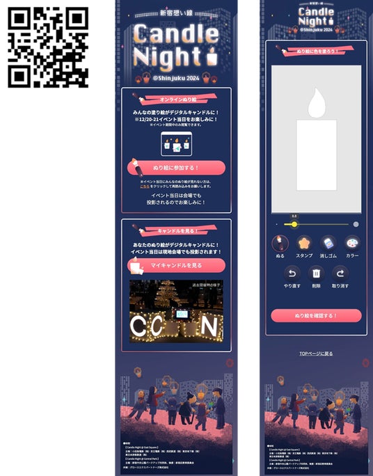 また、キャンドルホルダーのぬり絵は専用のオンラインサイトからもご参加いただけ、スマートフォンを使ってデジタルキャンドルを鑑賞ができます。さらに現地では、モニターに投影される参加者の皆様のデジタルキャンドルの鑑賞もお楽しみいただけます。