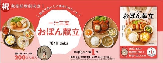 株式会社ワン・パブリッシング(東京都港区/取締役社長:松井謙介)は、11/28(木)に発売予定の大人気料理クリエイター・Hideka初のレシピ本『一汁三菜おぼん献立』(定価:1,540円(税込))の発売前増刷を決定いたしました。本書は予約開始前から反響が大きく、楽天ブックス限定で販売した“おぼんと書籍のセット”は即完売。さらには、発売前にも関わらずAmazonと楽天ブックスの両サイトの簡単レシピ部門、和食・おかず部門にて1位(※)を獲得しています。