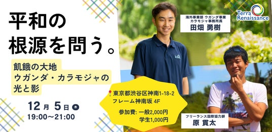 認定NPO法人テラ・ルネッサンス(理事長:吉田真衣、所在地:京都府京都市、以下テラ・ルネッサンス)は、2024年12月5日(木)に、フリーランス国際協力師の原貫太氏と、テラ・ルネッサンスウガンダ駐在員の田畑勇樹による対談イベント「平和の根源を問う。飢餓の大地ウガンダ・カラモジャの光と影」を東京都渋谷区にて開催いたします。