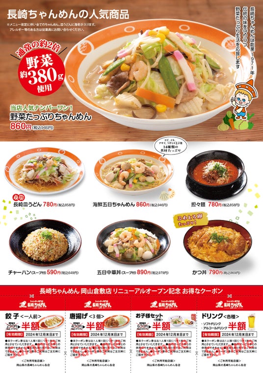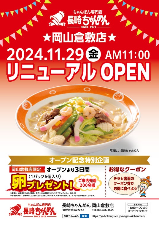 野菜や魚介の具材が楽しめるちゃんぽんの良さとコシのある生麺とスープが主役のラーメンの良さを掛け合わせた独特のメニューで50年以上営業をしてきました「長崎ちゃんめん」。この岡山倉敷店が11月29日(金)にリニューアルオープンいたします。グランドオープンしたのは1987年10月。この度、27年ぶりに店内、外観を改装し新調いたします。そして、3日間限定にて先着200名様に「卵プレゼント」がございます。(詳細は下記に記載)一番人気の「野菜たっぷりちゃんめん」や、名物の「長崎皿うどん」など、これからの季節にぴったりのメニューでお楽しみ下さい。皆さまのご来店をスタッフ一同お待ちしております。