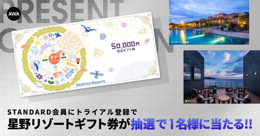 AWA株式会社(本社:東京都港区、代表取締役CEO:冨樫晃己)が運営する、サブスクリプション型(定額制)音楽ストリーミングサービス「AWA(アワ)」は、2024年11月27日(水)より、AWA STANDARD会員へのトライアル登録者を対象に、星野リゾート宿泊ギフト券 5万円分が抽選で1名様に当たるプレゼントキャンペーンを開催いたします。