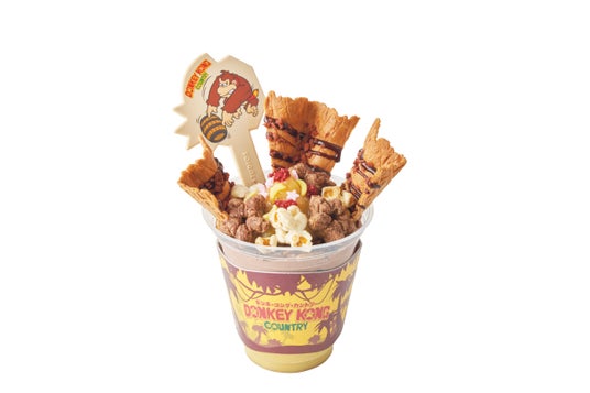 『ドンキーコング・カントリー』で発売するトロピカルな味わいのドリンク「DK クラッシュサンデー ~トロピカルバナナ・フレーバー~」に、冬限定のホットバージョンが加わります。投げたタルが豪快に割れる、ゲームでおなじみの瞬間をそのまま表現した楽しいホットドリンクは、温かいバナナオーレがたっぷり! 付属のドンキーコングのスプーンで、バナナピューレ&チョコホイップを混ぜてお召し上がりください。