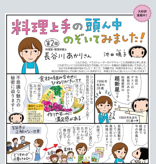 これまでにいくつかの苦手を自力で克服してハウツーを兼ねた体験談を描いてきた漫画家の池田暁子さんが、「料理が苦手さん」を代表して、毎日の料理が少しでも楽になるヒントを探すべく、料理上手さんに会いにいく人気連載。