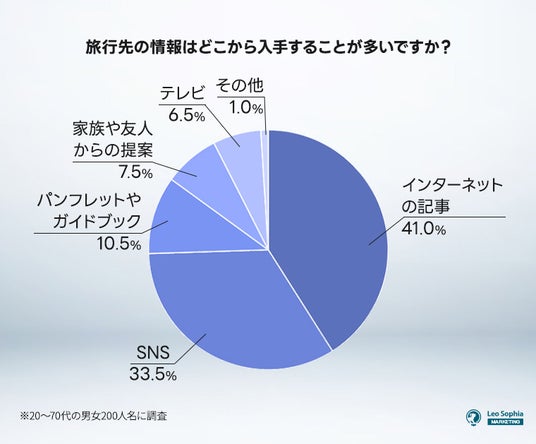 旅行先の情報は、41.0%以上の方がインターネットを活用しているという結果になりました。忙しい日々の中で目的地や観光先について調べるには、情報量と利便性に長けたインターネットが適しています。インターネットに次いで、SNSを使用している方も33.5%と比較的多いです。