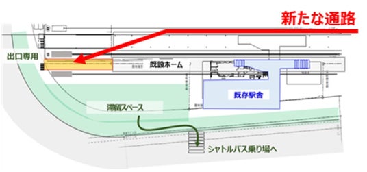 ・ホーム終端部に新たな通路と臨時改札口(出口専用4通路)を設置します。