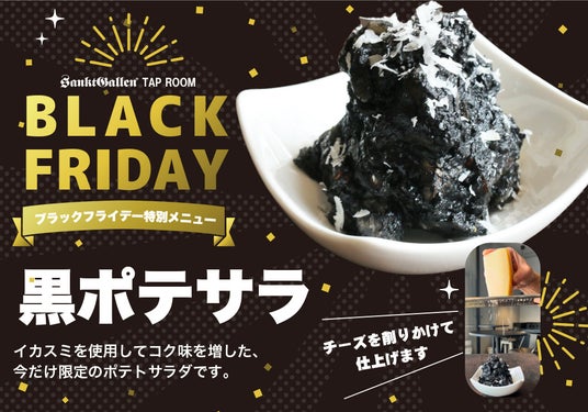 元祖地ビール屋サンクトガーレンの樽生ビール20種が楽しめる直営ビアバー「サンクトガーレン タップルーム(本厚木駅ビル 本厚木ミロード2 1階/オーナー 岩本伸久)」は2024年11月27日(水)より、ブラックフライデー特別メニュー「黒ポテサラ」を販売します。