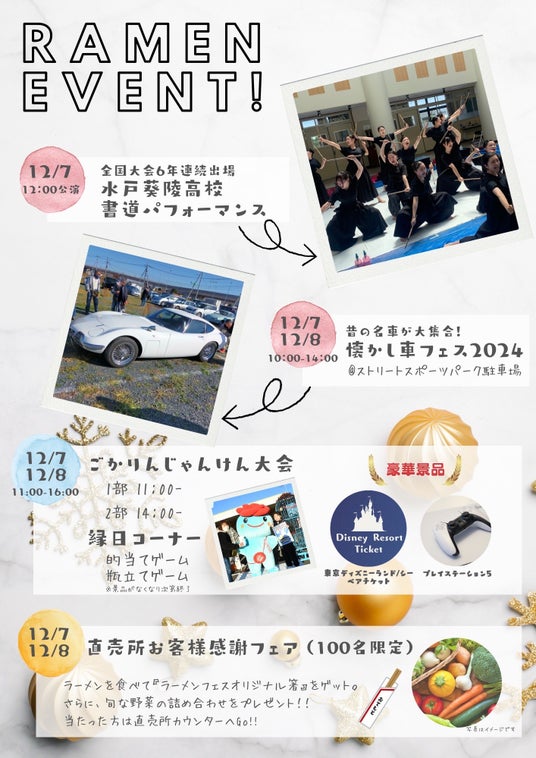 公募により募集した全7店舗のラーメンキッチンカーが五霞町に結集。各日5店舗が参加し、南は東京から、北は山形まで自慢のラーメンを携えて五霞町の冬を暖かくしてくれます。また、なつかし車フェスは7日(土)にクラシックカー、8日(日)にネオクラシックカーイベントや、子供から大人まで楽しめる縁日ブース(的当てゲーム、瓶立てゲーム)と五霞町のイメージキャラクター「ごかりん」とふれあえる「ごかりんじゃんけん」では豪華景品をご用意しています。