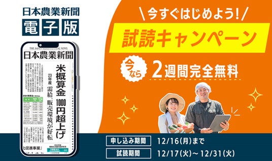 日本農業新聞(本社:東京都台東区、代表取締役社長:田宮和史郎)は、「日本農業新聞電子版」(通常価格月額2,403円)を2週間無料でお試し読みいただけるキャンペーンを、11月26日(火)から始めました。応募締め切りは、12月16日(月)。ぜひこの機会に、日本農業新聞電子版をお試しください。