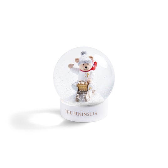 ザ・ペニンシュラ フェスティブベア スノードームきらめく雪の結晶が、冬の装いをしたかわいいペニンシュラベアの周りを舞い散ります。装飾の施されたそりに乗ったベアが、皆に向けて温かい祝福とホリデーの喜びを届けるかのように手を振っています。贈り物に最適なスノードームです。