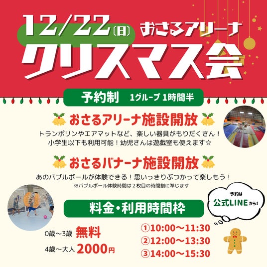 家族みんなで楽しめる特別なクリスマス会を、ぜひおさるアリーナ&おさるバナーナでお過ごしください!皆様のご来場を心よりお待ちしております。