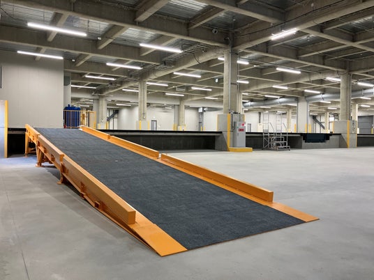 建物は延床約3,400坪の3階建ボックス型で、1階にトラックバースと2カ所のオフィススペースや荷物用エレベーター、垂直搬送機を各2基ずつ設置しています。また、大型トラックと普通自動車用の出入口を完全に分離することにより、安全で効率的な動線を確保しています。