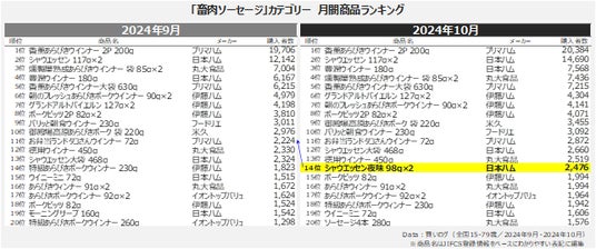 では、発売から1ヶ月間で「シャウエッセン(R)夜味」は果たして何位にランクインできたのでしょうか。発売前後の9月と10月で「畜肉ソーセージ」の月間売れ筋商品ランキングを調べたところ、10月に「シャウエッセン(R)夜味」は、並み居る既存品をおさえて「14位」にランクインしていました。なお、「シャウエッセン(R)夜味」の月間購入者数2,476人は前月9月の11位に相当する人数です。それだけ注目され、気になる存在だったのかもしれませんね。