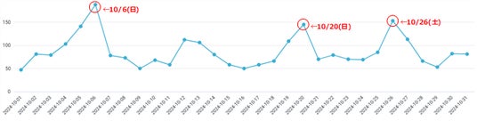 10月1日から31日までの日別購入者数を調べてみました。日別推移をみると、発売後6日目で10月最初の日曜日にあたる6(日)が最多人数であることが分かります。次いで26(土)、20(日)の順で購入者数が多いため、土日に買ってその日の夕食に、もしくは平日の夕食のために買い置きした人が多かったのかもしれません。