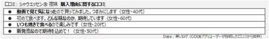 それでは、実際に商品を購入した人はどんな評価をしているのでしょうか。CODEで収集している「シャウエッセン(R)夜味」を買った人の口コミをいくつか紹介したいと思います。まずは購入理由に関する口コミです。