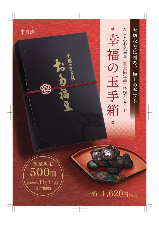 合名会社だるま(本社:長野県伊那市、代表:本田敏和)は、創業以来70年以上にわたり愛され続けている"お多福豆"を、お歳暮シーズンに向けた特別なギフトパッケージ「幸福の玉手箱」(1,620円税込)として、2024年11月1日より500個限定で販売を開始します。黒を基調とした気品ある装いに、赤い花模様と水引をあしらった帯が、伝統の味わいに新たな価値を添えます。