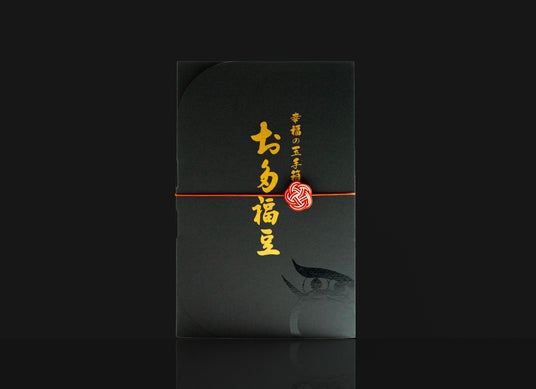 今回の「幸福の玉手箱」は、贈答品としての品格を第一に考えた特別なパッケージです。黒を基調とした上質な装いは、これまでの"お多福豆"では表現できなかった高級感を演出。そこに施された赤い花模様と水引の帯は、受け取られた方の目を楽しませる和モダンなアクセントとなっています。