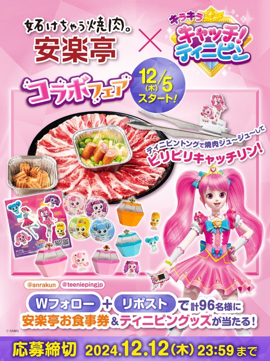 焼肉レストラン安楽亭(本社:埼玉県さいたま市、代表取締役:柳 先)は2024年12/5(木)~2025年1/13(月・祝)の期間『安楽亭×キラキラ キャッチ!ティニピン コラボフェア』を開催します。