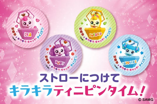 物語のキーアイテムである宝石、ダイヤ、ルビー、エメラルド、サファイヤのキラキラを描いたクリームソーダには「ハチュピン」「ココピン」「ニコピン」「マコピン」を配したストロータグ付き!