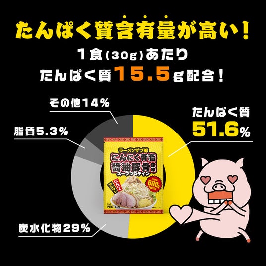 ラーメン好きにはたまらない、濃厚なにんにくが香るフレーバーで、タンパク質が腹持ち良く、ラーメン欲をしっかり満たしてくれます。