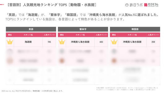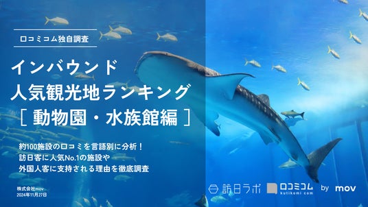 業界最大級のインバウンドビジネスメディア「訪日ラボ」及び 店舗向け集客一元化プラットフォーム「口コミコム」を運営する株式会社mov(代表取締役:渡邊 誠、本社:東京都渋谷区、以下mov)は、国内動物園・水族館に寄せられた最新の口コミデータから、独自の『インバウンド人気観光地ランキング』を発表しました。