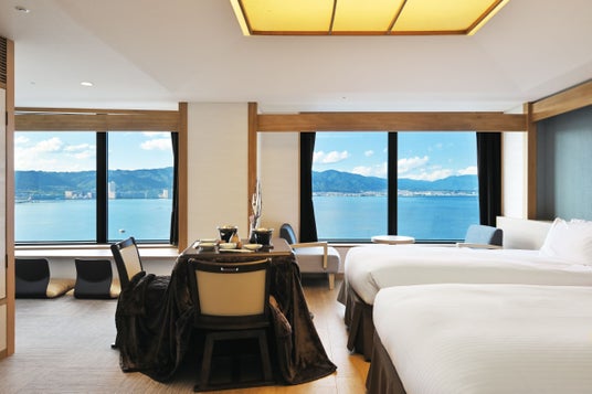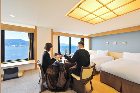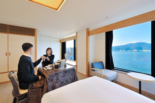 本プランでは、京都駅から2駅10分という好アクセスながらも人混みを避けてゆったりと観光をお楽しみいただける冬のびわ湖大津旅を通じて、忙しい日常から離れ「普段は言えない感謝の気持ちを伝えられる特別な時間」を提供し、より絆深まるひと時をお過ごしいただきたいという思いから、1日3室限定の「天空のこたつルーム」をご用意。高層階からの絶景レイクビューを眺めながら、温かなこたつでまったりとお過ごしいただけます。