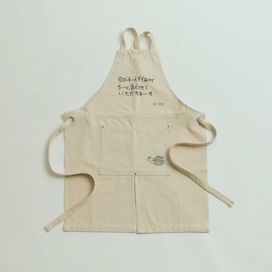 【ken kagami × TAKUNABE × FAT CLUB】のコラボエプロンになります。しっかりとした生地が特徴で、カラーは使いやすいアイボリーになります。大きなポケットと小さいポケット2つと機能性もあり、緑のTAKUNABE亀(ken kagami氏 デザイン)の個性もきらりと光ります。胸に大胆にあしらったken kagami氏の文字はインパクトがあり、これから料理をする(食べる)意気込みを感じる一品です。ファッションアイテムとしても、個性が光るコラボエプロンです。