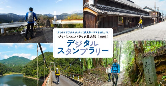 奥大和エリアのジャパンエコトラックへの登録を記念し、デジタルスタンプラリーを開催します。「ジャパンエコトラック奥大和」に登録されているサイクリング・トレッキングルートの内、キャンペーンルートを完走し、デジタルスタンプを集めてアンケートに答えると、ご当地グッズやアウトドア用品があたるプレゼント抽選に応募できます。多くの皆さんのご参加をお待ちしています。