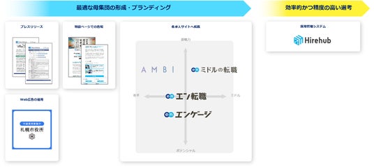 プレスリリースや特設ページ、Web広告での告知に加え、各求人サイトでの集客支援を実施。『エン転職』『エンゲージ』『AMBI』『ミドルの転職』とターゲットの異なる求人サイトを活用することで、ターゲットへ網羅的に求人を届けます。さらに、採用管理システム『Hirehub』の提供により、選考フローを支援。求職者との適切なマッチングを実施します。