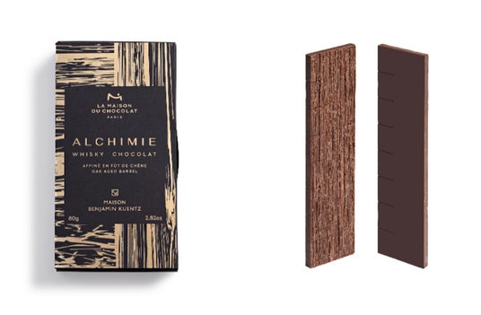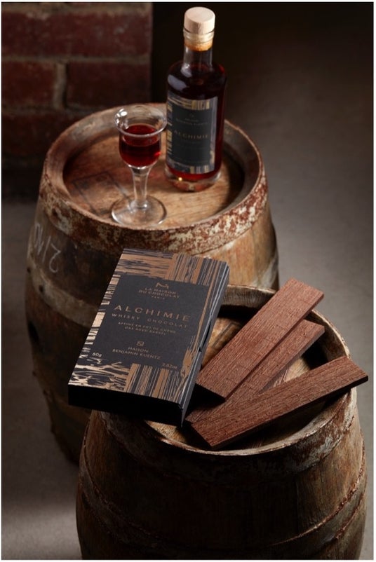 オーク樽で液体状のチョコレートを数週間熟成させることによって、木に染み込んだウィスキーの味わいを吸収したタブレットに創り上げられます。ウィスキーを抜いたばかりの樽に熱いチョコレートを注ぐと、チョコレートは木に触れることで香りを吸収し、蒸留酒の力強いアロマを蓄えます。このような工程を経て、ラ・メゾン・デュ・ショコラのタブレットはより強く、豊かなアロマに加えて、ウィスキーと木のノートをより深く感じられる味わいに仕上がっています。