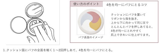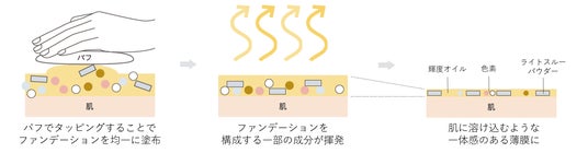 パフでタッピングしてなじませることで厚みが均一になり、さらにファンデーションを構成する一部の成分が揮発する処方により、肌に溶け込むような薄膜に仕上げる設計。